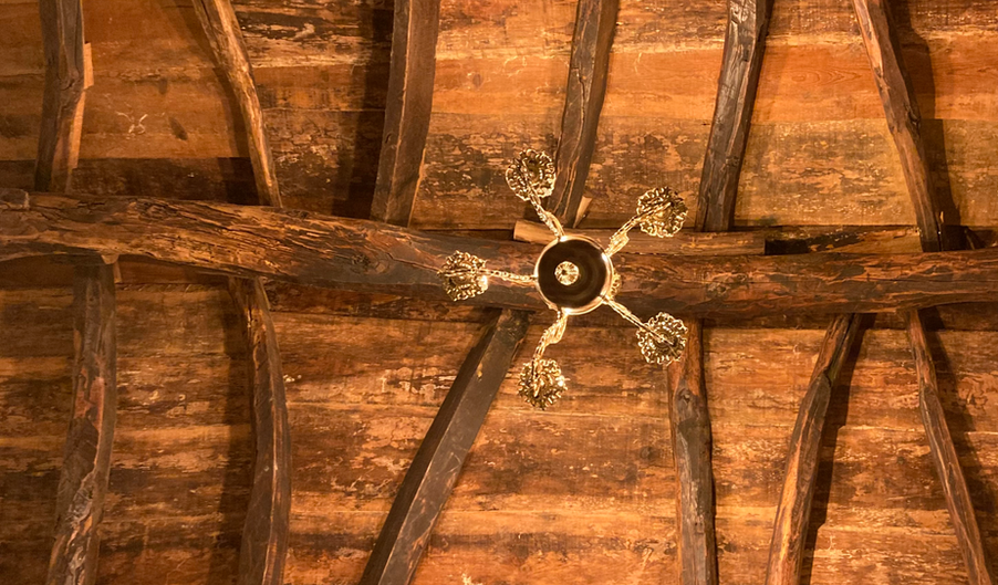 Thick walls, exposed beams and natural light create a sense of warmth and calm throughout the space